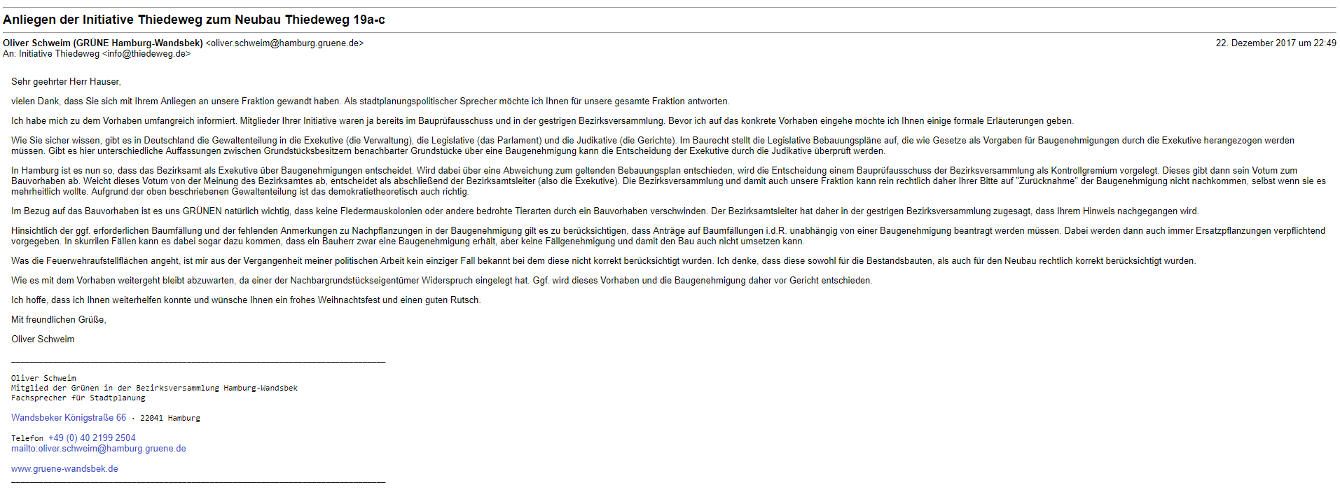 Nun heißt es abwarten. Sowohl die Fällgenehmigung als auch die Prüfung bzgl. der Fledermausnistplätze können das Bauvorhaben noch kippen. Wenn jemand weiterführende Ideen hat, was wir noch tun können, schreibt entweder einen Kommentar oder wendet euch direkt an info@thiedeweg.de! Danke!