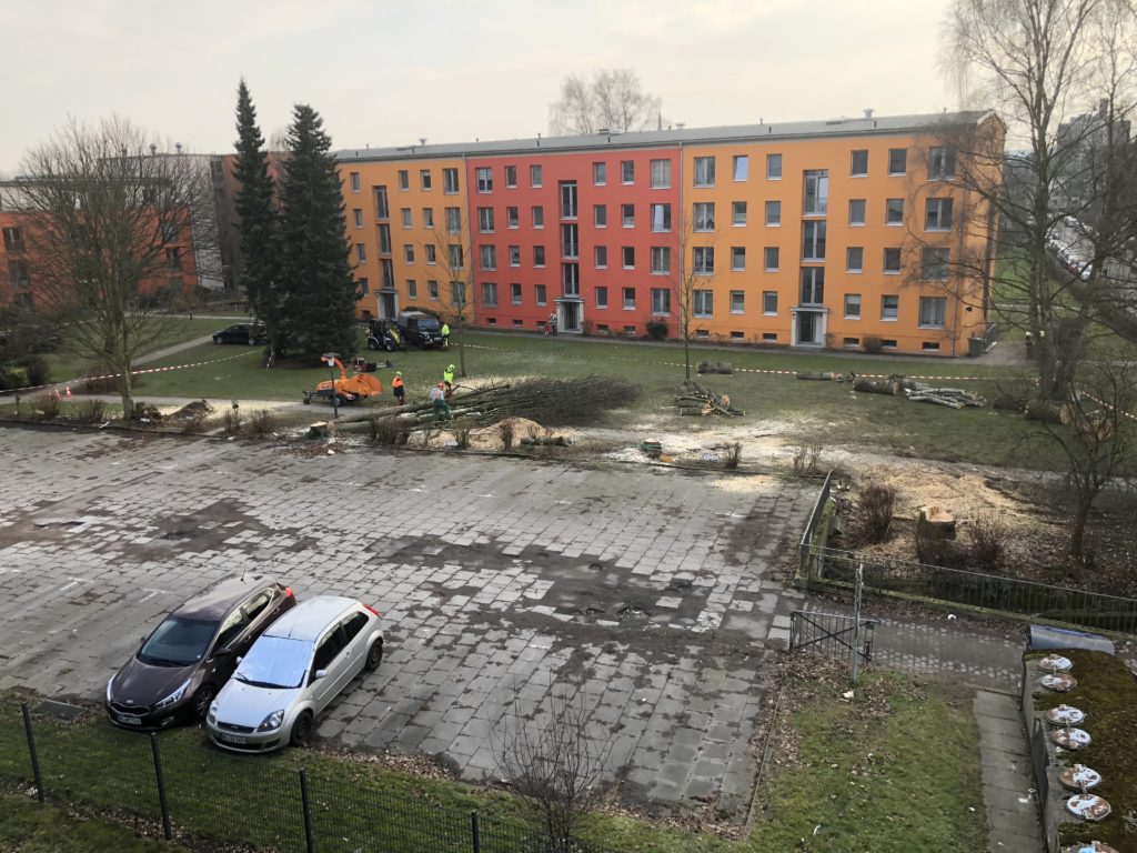 2. Die Bäume wurden gefällt, da diese eine Gefahr für Mensch und umliegende Autos darstellen. Ich möchte erinnern, dass vor 4 Wochen, als Hamburg von einem Schneesturm heimgesucht wurde, ein Baum mitten auf den Parkplatz gefallen ist. Glücklicherweise wurde niemand verletzt, ebenso wenig Autos beschädigt, da zu diesem Zeitpunkt betroffene Autos unterwegs waren.