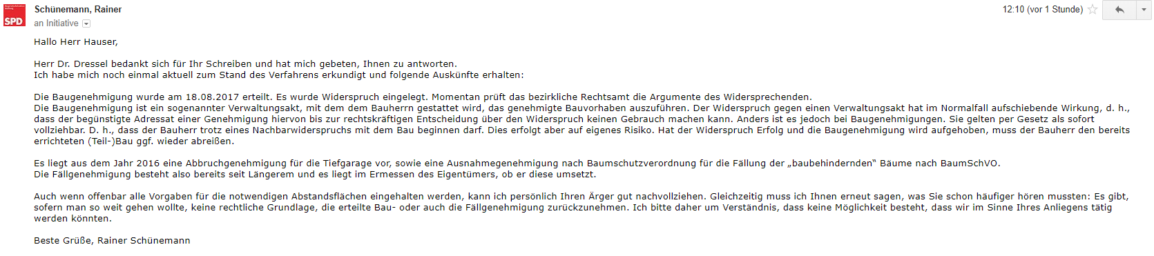 Um nichts unversucht zu lassen, habe ich mich natürlich auch noch einmal an SPD, Grüne und die Bezirksverwaltung gewandt. Bisher habe ich nur von der SPD eine Antwort erhalten, wonach es keine rechtliche Grundlage gibt, die erteilte Bau- und Fällgenehmigung zurückzunehmen. Das komplette Schreiben könnt ihr euch hier ansehen.